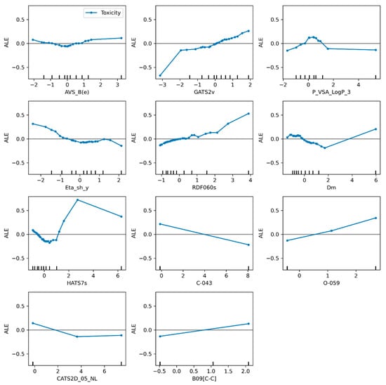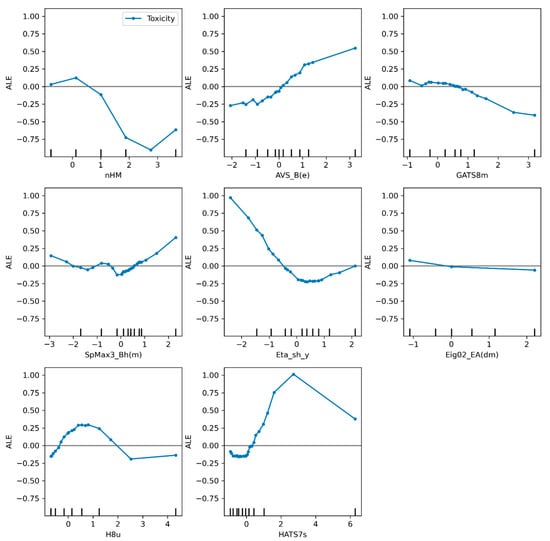 From these molecular descriptors, which are unique to each model, it can be seen that SVR_A has more volume- and shape-related descriptors such as GATS2v, a molecular descriptor weighted by van der Waals volume, and RDF060s which uses a radial distribution function. In the case of SVR_B, there are three descriptors related to the mass of the molecules: GAS8m (Geary autocorrelation of lag 8 weighted by mass), the nHM descriptor that considers the heavy atoms, and SpMax3_Bh(m), another molecular descriptor with a matrix weighted by mass. It should be emphasized that although both SVR_A and SVR_B include mass-, volume-, and electronic-related molecular descriptors as main features for describing toxicity, a topological descriptor such as B09[C-C] (presence/absence of C-C at topological distance 9) helps to describe the influence of large chains on the toxicity of molecules. Figure 5 and Figure 6 show the result of the method ALE for the models SVR_A and SVR_B.