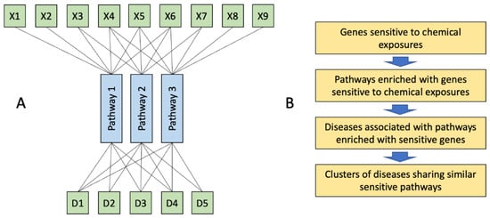 The whole person approach in toxicology. (A), Multiple xenobiotics (X) affect limited number of molecular pathways. Disruption of these pathways in different cells across the organisms may result in the development of seemingly unrelated diseases (D) which represent a syndrome of chemical exposure. (B), Outline of this study: genes sensitive to chemical exposures, identified by overlaying transcriptomic datasets from toxicological studies were used to identify pathways sensitive to chemical exposures. These pathways were further used to identify associated diseases. Finally, clusters of diseases sharing similar pathways were identified to predict syndromes of chemical exposures.