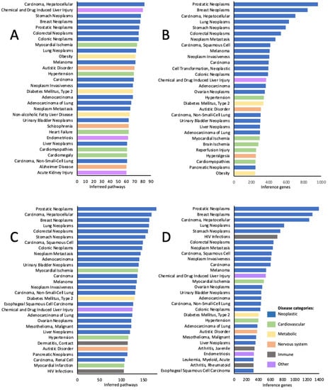 The lists of the top-ranking diseases based on both the number of inferred pathways (Figure 2 A,C) and the number of inference genes (Figure 2B,D) were highly similar and/or overlapping for both KEGG (Figure 2A,B) and Reactome (Figure 2C,D) curations. In all four analyses, the lists of the top-ranking diseases were dominated by various neoplasms including breast, stomach, prostatic, lung, colorectal neoplasms, hepatocellular carcinoma, and others. Among non-neoplastic conditions, the top-ranking diseases included metabolic disorders (obesity, type 2 diabetes, non-alcoholic fatty liver disease), neurodevelopmental and psychiatric disorders (autistic disorder, schizophrenia, Alzheimer’s disease, hyperalgesia), cardiovascular (hypertension, heart failure, cardiomyopathies, cardiomegaly, brain and myocardial ischemia, myocardial infarction, and reperfusion injury), and immune pathology (contact dermatitis, arthritis juvenile and rheumatoid and HIV infection). Among these, type 2 diabetes, hypertension, and autistic disorder were among the top conditions in all 4 types of analysis (Figure 2).