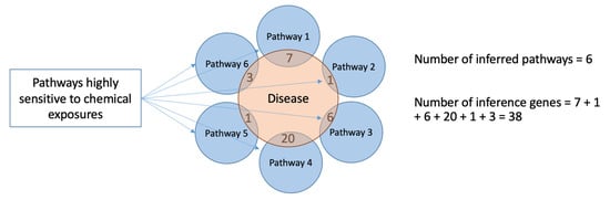 Two numeric values were used to quantify the sensitivity of disease states to chemical exposures (Figure 4): the number of inferred pathways associated with the disease state and the sum of genes from every pathway overlapping with the disease (number of inference genes). One disadvantage of this second metric is that some genes, members of multiple pathways, may be counted more than one time. The lists of disease categories with their corresponding numbers of inferred pathways and inference genes are shown in Mendeley data [].