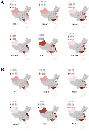 In this part of the study, we compiled and summarized the literature related to PBDE and PAE levels in different human tissues and fluids, including serum, cord blood, and breast milk. The literature was searched and classified through the China National Knowledge Infrastructure (CNKI, the largest Chinese database in the world), WAN-FANG DATA (a Chinese professional academic database named after CNKI), PubMed, and Web of Science between 2010 and 2020. Ultimately, 13 articles related to PBDE concentrations (Table S1) and 14 articles related to PAE concentrations (Table S2) were included in this study, and the relevant results were analyzed using ArcGIS 10.2 software.