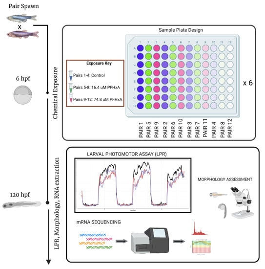 Tropical 5D wild-type zebrafish were housed at Oregon State University’s Sinnhuber Aquatic Research Laboratory (SARL, Corvallis, OR, USA) according to the Institutional Animal Care and Use Committee protocols []. Twelve pairs of adult zebrafish were placed into separate tanks and allowed to spawn. Embryos originating from each pair spawn are considered full siblings and referred to as a family. Embryos from each family were transferred to individual wells of 96-well plates. These embryos were developmentally exposed to one of 3 exposure conditions from 6 to 120 hpf to various concentrations of perfluorohexanoic acid (PFHxA; CAS: 307-24-4). PFHxA was purchased from and dissolved using 100% dimethyl sulfoxide (DMSO). The embryos were exposed to either 0.33% DMSO (vehicle control), medium PFHxA (16.4 μM PFHxA), or high PFHxA (74.8 μM PFHxA) with four families per exposure group. The exposures concentrations chosen were based upon results from previous larval behavioral studies carried out by our group and other groups where exposure to PFHxA showed discordant results at the lower concentration [,,]. We hypothesized that population variability could be playing a role in mediating toxic responses, especially in lower concentrations.