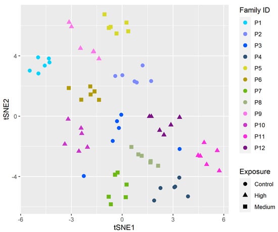 Next, we fit LMMs to each gene independently and carried out bootstrapping (n = 1000) to assess the significance of the GxE term for each gene. This analysis identified 3746 genes as having statistically significant gene-environment interaction. To visualize how expression of these genes cluster with exposure and family, we carried out tSNE analysis [] using normalized gene counts of only these 3746 genes (Figure 3). The pattern in Figure 3 shows clusters by family (color) and exposure concentration (shape).