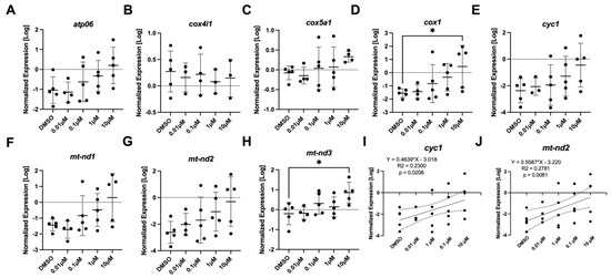 The expression levels of (A) atp06, (B) cox4i1, (C) cox5a1, (D) cox1, (E,I) cyc1, (F) mt-nd1, (G,J) mt-nd2, and (H) mt-nd3 in 7-day old larval zebrafish exposed to either 0.1% DMSO, 0.01 μM, 0.1 μM, 1 μM, or 10 μM PFTeDA. Each point is a biological replicate, and the horizontal line indicates the mean value of the group (mean ± S.D.) (one-way ANOVA with a Dunnett’s multiple comparisons test, n = 3–5/group). An asterisk denotes a significant difference at * p < 0.05 from the solvent control.