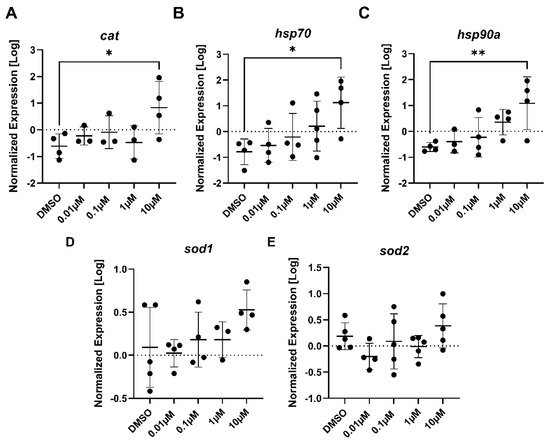 The expression levels of (A) cat, (B) hsp70, (C) hsp90a, (D) sod1, and (E) sod2 in 7-day old larval zebrafish exposed to either 0.1% DMSO, 0.01 μM, 0.1 μM, 1 μM, or 10 μM PFTeDA. Each point is a biological replicate, and the horizontal line indicates the mean value of the group (mean ± S.D.) (one-way ANOVA with a Dunnett’s multiple comparisons test, n = 3–5/group). An asterisk denotes a significant difference at * p < 0.05 or ** p < 0.01 from the solvent control.