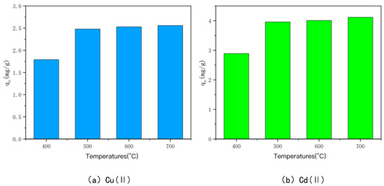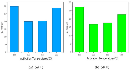The amounts of Cu(II) and Cd(II) adsorbed by KOH-activated modified bamboo charcoal at different activation temperatures are shown in Figure 4. The adsorption amounts of Cu(II) and Cd(II) were 29.79 mg/g, 19.97 mg/g, 20.20 mg/g, and 20.20 mg/g, respectively, when the activation temperature was 400 °C, 500 °C, 600 °C, and 700 °C. The adsorption amounts for Cu(II) were 29.79 mg/g, 19.97 mg/g, 20.20 mg/g, and 28.70 mg/g, and for Cd(II), they were 27.20 mg/g, 16.69 mg/g, 17.59 mg/g, and 22.65 mg/g, respectively, when the activation temperature was 400 °C. The adsorption of Cd(II) and Cu(II) was the highest. This may be due to the fact that increasing the activation temperature at a high alkali-to-carbon ratio causes significant ablation of the carbon, which reduces the active carbon spots on the surface and consequently decreases the adsorption performance of the carbon [45,46]. A similar phenomenon has been observed, i.e., the saturation adsorption capacity of the char is roughly negatively correlated with the activation temperature when the alkali-to-carbon ratio is too high, and the larger the alkali-to-carbon ratio, the more obvious the phenomenon is.