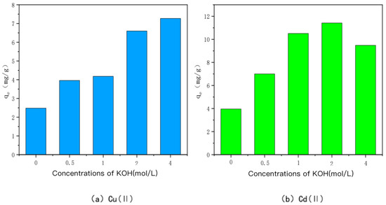 The adsorption capacity of Cu(II)/Cd(II) adsorbed by KOH-modified carbon at different concentrations of KOH.