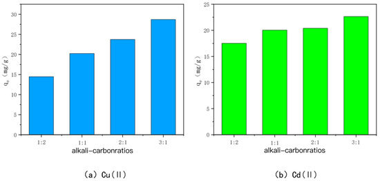 The adsorption capacity of Cu(II)/Cd(II) by KOH-activated modified carbon at various alkali-to-carbon ratios.