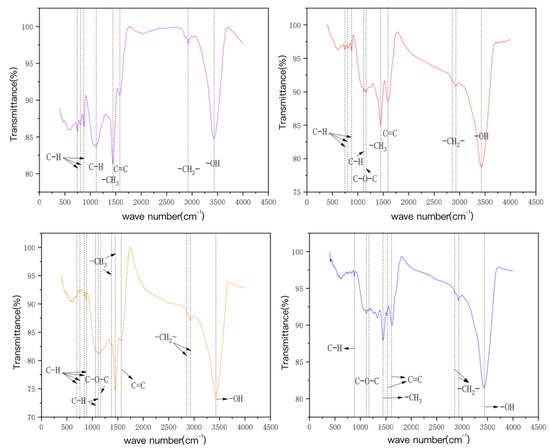 The characteristic FT-IR spectra peaks of bamboo charcoal and bamboo charcoal-modified charcoal, as shown in Figure 7 for BC500, are mainly aromatic hydrocarbons (C–H and C = C), fatty hydrocarbons (–CHx), hydroxyl groups (–OH), etc. The characteristic spectrum peak of KBC500-2 increases the oxygen-containing functional group (C–O–C) compared with BC500, and its vibration mode is aromatic ether expansion vibration. HBC500-30 contains fewer aromatic hydrocarbons (C-H) than BC500, probably because HNO3 is strongly oxidized as a strong acid, oxidizing some unstable functional groups and neutralizing them with the alkaline functional groups on the carbon surface [51,52,53,54,55]. In addition, HBC500-30 forms an aromatic hydrocarbon (C = C), an oxygen-containing functional group (C–O–C), and a fatty hydrocarbon (–CH2−), whose vibration modes are aromatic ring skeleton vibration, aromatic ether expansion vibration, and symmetry extension vibration of the long-chain methylene group, respectively. Compared with BC500, KAM500-400-3 has significantly more absorption peaks, including aromatic hydrocarbon (C–H), oxygen-containing functional group (C–O–C), adipose C hydrocarbon (–CHx), etc. The vibration modes are respectively the out of plane bending vibration of aromatic ring C-H, the stretching vibration of aromatic ether, the in-plane bending vibration of aromatic ring C-H, and the antisymmetric stretching vibration of long chain methylene, which further explains the reason why the KOH activated carbon has strong adsorption capacity for heavy metals Cu (II) and Cd (II). [56,57].