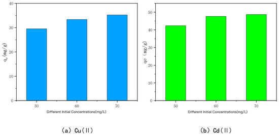 The relationship between the adsorption amount of KAM500-400-3 on Cu(II) and Cd(II) and the initial concentrations of Cu(II) and Cd(II) is shown in Figure 8. When the initial concentrations of Cu(II) and Cd(II) were 50 mg/L, 60 mg/L, and 70 mg/L, the adsorption amounts of KAM500-400-3 were 29.53 mg/g, 33.36 mg/g, and 35.24 mg/g for Cu(II) and 42.35 mg/g, 47.65 mg/g, and 48.68 mg/g for Cd(II), respectively. From the experimental results, it can be seen that the adsorption of Cu(II) and Cd(II) by the optimal modified effect carbon increased with the increase in the initial concentration, but the adsorption amount leveled off after reaching a certain adsorption time because the driving force to overcome the mass transfer resistance improved with the increase in the initial concentration [69,70,71,72,73]. When the initial solution of Cu(II) and Cd(II) is at a low concentration, the number of heavy metal Cu(II) and Cd(II) ions is limited. KAM500-400-3 has sufficient surface adsorption sites and functional groups, and a large number of active sites compete for the limited Cu(II) and Cd(II) ions. Cu(II) and Cd(II) ions and carbon adsorption can be produced rapidly, but the adsorption amount of KAM500-400-3 for heavy metals Cu(II) and Cd(II) is not high because the adsorption sites are not fully utilized. As the initial concentration increases, the concentration gradient between KAM500-400-3 and the solution interface increases, causing Cu(II) and Cd(II) to migrate from the solution to the solid surface, and a large amount of free Cu(II) and Cd(II) compete for the limited adsorption sites and functional groups on the surface of KAM500-400-3, causing it to gradually reach the adsorption saturation state. The excess of the optimal modified carbon at the initial concentration is converted into an excess of heavy metals Cu(II) and Cd(II), the adsorption amount does not increase indefinitely once it reaches a certain value.