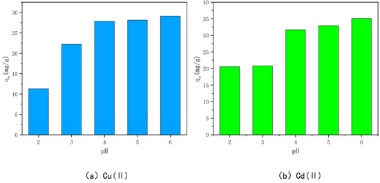The effects of different initial solution pH on the adsorption of Cu(II) and Cd(II) by the optimally modified bamboo charcoal are shown in Figure 9. When the pH is 2, the adsorption of Cu(II) and Cd(II) by the optimally modified bamboo charcoal is the smallest—11.28 mg/g and 20.54 mg/g, respectively. This indicates that a lower pH is not ideal for the adsorption of Cu(II) and Cd(II) by optimally modified bamboo charcoal, but the adsorption of Cu(II) and Cd(II) increased with an increase in solution pH (pH < 7). This is because the solution pH can change the morphology of heavy metals and affect the degree of protonation and deprotonation of functional groups on the surface of optimally modified bamboo charcoal [74,75]. When the pH of the solution is small and acidic, the ionic forms of Cu(II) and Cd(II) in the solution are primarily Cu(II), Cu(OH)+/Cd(II), and Cd(OH)+, and the H+ in the solution will electrostatically repel them and compete for the active sites on the char surface together, inhibiting the adsorption of Cu(II) and Cd(II) on the char.