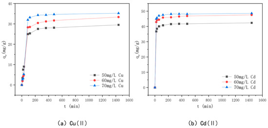 The relationship between adsorption time and adsorption amounts of Cu(II) and Cd(II) by KAM500-400-3 is shown in Figure 10. The figure shows that when the Cu(II) and Cd(II) solution concentrations are 50 mg/L, 60 mg/L, and 70 mg/L, respectively, the adsorption time follows approximately the same trend as the adsorption amounts. The adsorption of Cu(II) by KAM500-400-3 increased rapidly in the first two hours of adsorption, increased slowly towards the adsorption equilibrium, and finally reached 29.53 mg/g, 33.36 mg/g, and 35.34 mg/g for Cd(II), respectively. The adsorption amount increased significantly in the first hour of adsorption and then slowly tended to the adsorption equilibrium. Because the adsorption sites, pore structure, and functional groups on the surface of KAM500-400-3 are sufficient at the start of adsorption, the Cu(II) and Cd(II) adsorption amounts change rapidly [79]. However, after a period of adsorption, the adsorption sites on the surface of KAM500-400-3 are gradually occupied by heavy metal ions, the pore structure is further filled, the functional groups form complexes with heavy metal ions to stabilize the carbon surface, and the adsorption rate decreases because the concentration of heavy metal ions in the solution decreases at this time. Furthermore, because the surface of KAM500-400-3 is filled with Cu(II)/Cd(II) charges, and the Cu(II)/Cd(II) charges in the solution produce repulsion, making further adsorption difficult, with the increase in adsorption time, the adsorption of KAM500-400-3 for Cu(II) and Cd(II) tends to plateau after reaching a certain amount [80].