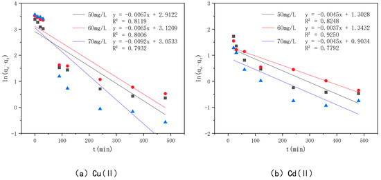 Pseudo-first-order kinetic models of different concentrations of Cu(II)/Cd(II).