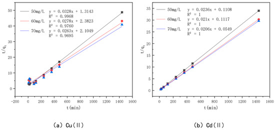 Pseudo-second-order kinetic models of different concentrations of Cu(II)/Cd(II).