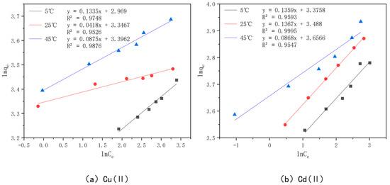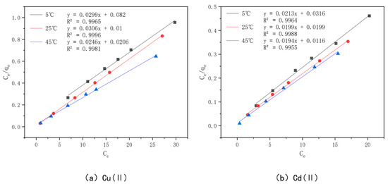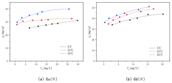 The adsorption isotherms for Cu(II) and Cd(II) adsorption at different temperatures are shown in Figure 14. The adsorption amount of the modified bamboo charcoal increases continuously for these two heavy metals as the volume of Cu(II) solution increases from 60 to 160 mL and the volume of Cd(II) solution increases from 70 to 140 mL. The adsorption of Cu(II) and Cd(II) by modified bamboo charcoal increased with increasing equilibrium concentration, but the increase in adsorption decreased gradually [82]. At temperatures of 5 °C, 25 °C, and 45 °C, the adsorption amounts of optimally modified bamboo charcoal reached 31.12 mg/g, 32.57 mg/g, and 39.91 mg/g for Cu(II), and 43.83 mg/g, 48.00 mg/g, and 51.00 mg/g for Cd(II), when the volume of Cd(II) increased from 60 to 160 mL, respectively. According to the experimental results, the optimal modified bamboo charcoal is more effective at treating a large amount of Cu(II) and Cd(II) solution with a higher concentration and has a better adsorption effect on Cd(II) than Cu(II) [83].