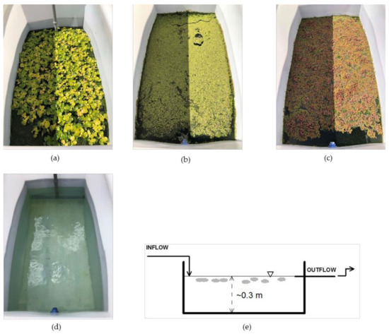 In total, four similar tanks were used for the present experiment (Figure 1). The L. minor and A. pinnata plants used were obtained from a local nursery (Attica, Greece) and reproduced in the actual test tanks, and Eichhornia crassipes was available from previous experiments and was reproduced in order to be used for the present study. In parallel to the plant-containing tanks, a control tank without plants was run (however, algae developed with time, acting as an oxidation pond) and was treated the exact same way as the macrophyte-containing tanks.