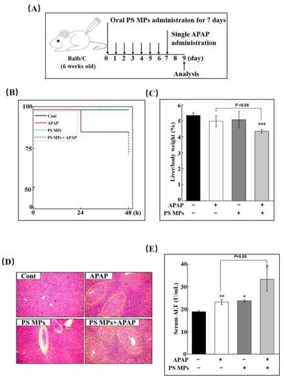 Microplastics (MPs) are ubiquitous environmental pollutants characterized as particles with diameters from 0.1 μm to 5 mm. Traceability investigation indicates MPs are mainly derived from textile, medicine, and personal care products, while additional hydrolysis, photochemistry, and biodegradation promote the production of smaller items []. Deep research on humans identifies that MPs exist in the placenta [], sputa [], stool [], and lung []. Especially, about 39,000–52,000 particles have been estimated to be consumed annually []. Polystyrene (PS) MPs rank top three in all types of plastics, confirming that PS MPs are the top three fragments in aqueous samples []. These investigations indicated the importance of evaluation of PS MPs toxicity. A mounting body of studies confirms that MPs are a health risk pollutant to cause cognitive impairment, cardiac damage, and intestinal injury []. Due to the pivotal role of the liver in detoxification, it frequently suffers from excessive attacks. PS MPs can induce oxidative stress, inflammatory response, metabolism disorder, apoptosis, pyroptosis, and ferroptosis in the liver [,,,]. Further co-exposure of MPs with epoxiconazole or cyclophosphamide exhibits excessive oxidative stress, more inflammatory cell infiltration, and increased serum alanine transaminase (ALT) [,]. However, whether existing PS MPs in the liver would impact hepatic recovery under acute liver injury is still uncertain. Hence, the current study aims to evaluate the role of PS MPs in drug-induced liver injury.