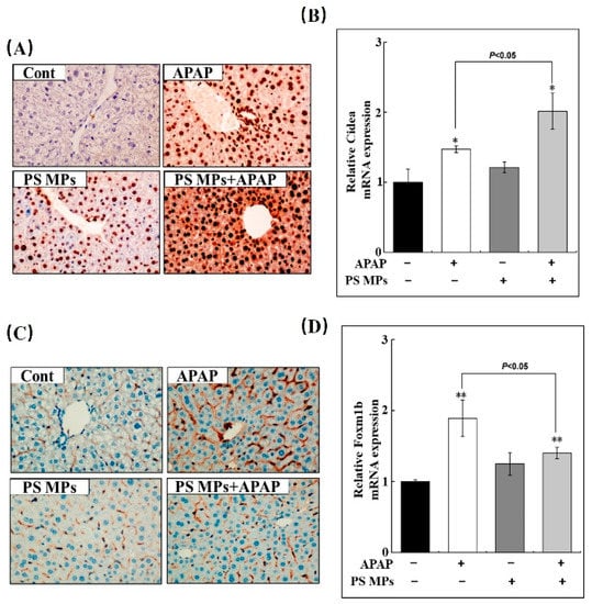 The prognosis of APAP hepatotoxicity depends on the balance between cell death and regeneration, while the latter exhibits cell proliferation requirements []. However, necrosis was considered the reason for hepatotoxicity in an early study, and further mechanism research confirmed the involvement of apoptosis []. Thus, we used TUNEL staining to detect cellular apoptosis in the liver. APAP, PS MPs, and APAP combined with PS MPs groups all induced different degrees of cell apoptosis in the liver (brown dots), especially in APAP with PS MPs group (Figure 2A). Cidea, the gene that participates in cell death, was chosen to evaluate cell apoptosis in the current study []. Compared to the control group, Cidea mRNA expression was increased 1.5-fold and 2-fold in APAP and APAP with PS MPs groups, respectively (Figure 2B, p < 0.05). Compared to APAP administrated group, Cidea transcriptional expression increased 33% in APAP combined with PS MPs group (Figure 2B, p < 0.05). Subsequently, Ki67, a protein necessary for DNA replication [], was detected through IHC. Compared to control group, Ki67 expression is significantly increased in APAP, PS MPs, and APAP combined PS MPs groups (Figure 2C, brown dots). Still, the expression of Ki67 in APAP with the PS MPs group is obviously less than in the APAP group, indicating that cell proliferation capacity decreased in the APAP combined PS MPs group. Further supporting these results, Forkhead Box M1b (Foxm1b), the gene that participates in cell proliferation [], was further examined. As shown in Figure 2D, hepatic Foxm1b increased 1.8- and 1.4-fold in APAP and APAP with PS MPs groups, respectively (p < 0.01), but the hepatic Foxm1b mRNA level in the APAP group is much higher than APAP with PS MPs group (Figure 2D, p < 0.05). These results indicate APAP plus PS MPs exposure not only worsens cell damage, but also weakens cell proliferation capacity. A similar role of PS MPs in cell apoptosis induction and cell proliferation inhibition is commonly observed [,,].