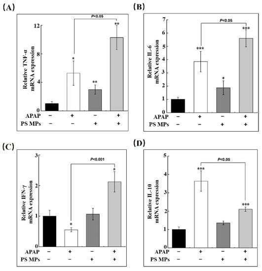 APAP-caused DAMPs are the activators of the inflammatory response, which initiates the production of inflammatory cytokines associated with the type of immune cells and impacts the APAP-induced damage and regeneration []. Hence, we detected tumor necrosis factor-alpha (TNF-α), interleukin-6 (IL-6), and interferon-gamma (IFN-γ), which belong to the pro-inflammatory cytokines family. Compared to the control group, TNF-α mRNA expressions in APAP, PS MPs, and APAP combined PS MPs groups increased 5.5- (p < 0.05), 3.2- (p < 0.01), and 10-fold, respectively (p < 0.01) (Figure 3A). The variation of TNF-α mRNA in the APAP with PS MPs group is more potent than the APAP group, indicating that APAP with PS MPs exhibited a severe pro-inflammatory response (Figure 3A, p < 0.05). Similar to TNF-α transcriptional variation, IL-6 level was increased 3.8- (p < 0.001), 1.9- (p < 0.05), and 5.5-fold (p < 0.001) upon APAP, PS MPs, and APAP with PS MPs administration, Figure 3B. Furthermore, IFN-γ mRNA expression displayed ~50% reduction in the APAP administration group (p < 0.05), and a slight increase was found in the PS MPs group. However, IFN-γ mRNA expression increased 2.1-fold in APAP combined PS MPs administration group compared with the control group (p < 0.05) (Figure 3C). Interleukin-10 (IL-10) is classified as an anti-inflammatory factor to inhibit pro-inflammatory cytokines from achieving tissue regeneration []. In contrast to TNF-α, IL-6, and IFN-γ, although APAP and APAP with PS MPs groups enhanced IL-10 mRNA expressions (p < 0.001), the variation of APAP with PS MPs group is significantly lower than APAP group (Figure 3D, p < 0.05). The mRNA variation of anti-inflammatory and pro-inflammatory genes indicates that APAP exhibits apparent anti-inflammation potency rather than APAP plus PS MPs. The above variation tendency of inflammatory cytokines is in accord with APAP []. Still, a recent study concerning microplastics observed similar pro-inflammatory cytokines in the liver []. Our results are also consistent with the research of PS MPs on acute colitis to induce inflammatory effects []. To sum up, mice co-exposed with APAP and PS MPs exhibited severe pro-inflammatory impacts rather than an anti-inflammatory state. We speculated that the initiation of liver recovery is impeded.