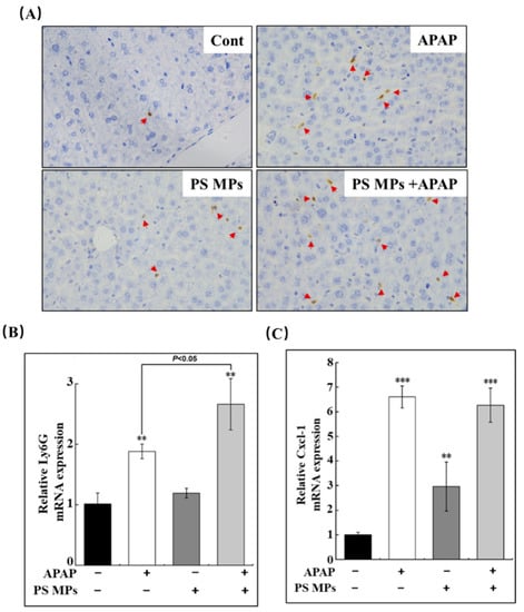 Due to the pro-inflammatory state being dominated in APAP combined with the PS MPs group in the liver, the recruitment of neutrophils should be considered. Neutrophil has been identified to participate in liver recovery by boosting macrophage conversion from the pro-inflammatory to the anti-inflammatory stage [,]. Next, we tested the neutrophil marker Ly6G in the liver after APAP treatment for 48 h. As shown in Figure 4A, APAP and APAP-combined with PS MPs administration group had conspicuous Ly6G in the liver section (brown dots, as indicated by red arrows), but APAP with PS MPs displayed more capability in neutrophils recruitment than the APAP group. The mRNA variation was also tested to confirm the expression of Ly6G. According to the Ly6G IHC result, hepatic Ly6G mRNA expressions were increased in APAP and APAP with PS MPs groups compared to the control (Figure 4B, p < 0.01). The relative Ly6G mRNA level in APAP with PS MPs group was higher than APAP group (Figure 4B, p < 0.05). Chemokine C-X-C motif ligand 1 (Cxcl-1) was considered a chemoattractant for neutrophil infiltration []. Thus, we evaluated Cxcl-1 transcriptional expression in the liver. In Figure 4C, Cxcl-1 mRNA levels were boosted 6.6-, 3-, and 6.2-fold within APAP, PS MPs, and APAP plus PS MPs administrated groups, respectively, while there is no disparity between APAP and APAP plus PS MPs groups (Figure 4C). The changes of Cxcl-1 expression on APAP administration are in line with a previous study []. Thus, the above information declared that APAP and APAP with PS MPs groups could accelerate neutrophil recruitment, while APAP with PS MPs co-treatment exhibits more robust capacity than APAP. Thus, the delayed liver recovery activation could not be attributed to neutrophil recruitment in the current study.