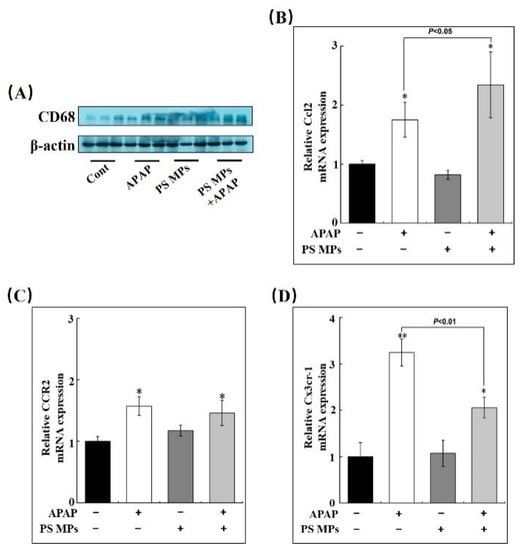 Macrophages are under investigation due to their particular role in removing necrotic debris to achieve hepatic regeneration []. Thus, we checked their markers to assess accumulation capacity in the liver. The cluster of differentiation 68 (CD68) is defined as an indicator of resident macrophages [], which was determined through Western blotting in the current study. In Figure 5A, CD 68 expression is higher in APAP, PS MPs, and APAP pretreated with PS MPs groups compared to the control (Figure 5A). Infiltrated monocyte-derived macrophages are non-negligible in tissue repair as well []. Ccl2 was responsible for monocyte-derived macrophage recruitment that was quantified through RT-qPCR. Significant Ccl2 expression was observed in the single APAP group and APAP co-exposure with PS MPs group (p < 0.05), but APAP combined with PS MPs group increased ~30% compared to the single APAP group (Figure 5B, p < 0.05). To confirm the infiltrated monocyte-derived macrophage in the liver, CC chemokine receptor 2 (CCR2), the marker of monocyte-derived macrophage, was considered []. As shown in Figure 5C, APAP and APAP plus PS MPs significantly up-regulated CCR2 mRNA transcriptional expression in the liver, respectively (p < 0.05), but no significance is observed between APAP and APPA plus MPs groups. Chemokine CX3C receptor 1 (Cx3cr1) is abundant in pro-resolving monocyte-derived macrophages rather than pro-inflammatory macrophages []. Subsequently, we checked Cx3cr1 expression in the liver section. Cx3cr-1 mRNA expression increased 3.3-fold in the APAP challenged group compared to the control (Figure 5D, p < 0.01). However, APAP combined PS MPs group was up-regulated by merely 2.1-fold (p < 0.05), which is lower than APAP treated group (Figure 5D, p < 0.01). Analogously, the alterations of Ccl-2, CCR2 and Cx3cr1 expression upon APAP are in line with the previous studies [,]. However, these results uncovered that APAP co-administrated with PS MPs is more capable of macrophage recruitment in the liver than APAP-treated mice. However, single APAP administration mice exhibited greater anti-inflammatory priority.