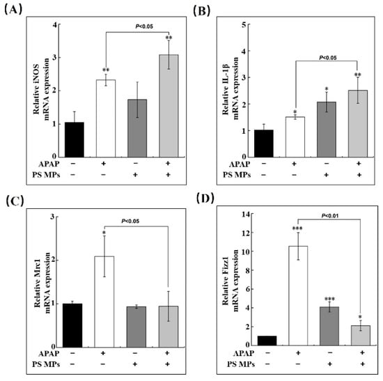 In order to identify the states of macrophages in the liver which are associated with liver regeneration, further assessment of M1/M2 macrophage markers was performed since excessive M1-type macrophages would exacerbate liver damage []. As presented in Figure 6A, induced nitric oxide synthases (iNOS), a standard pro-macrophage marker, dramatically increased in APAP and APAP pretreated with PS MPs groups (2.3- and 3-fold respectively, p < 0.01) compared to control. Compared to the APAP group, APAP plus PS MPs group was further enhanced by 30% (Figure 6A, p < 0.05). Similar to iNOS, the variation of another -M1 gene, interleukin 1 beta (IL-1β), increased 1.5- (p < 0.05) and 2.4-fold (p < 0.01) upon APAP and APAP with PS MPs administrations (Figure 6B). Both iNOS and IL-1β results indicate that APAP and APAP with PS MPs treatments could enhance the transcriptional expression of pro-inflammatory factors. However, APAP with PS MPs treatment group has a more substantial impact than the APAP group. By contrast to iNOS and IL-1β, the expressions of M2 relative gene mannose receptor C-type 1 (Mrc1) and resistin-like molecule-alpha (Fizz1) are significantly increased in the APAP group, compared to the control group (p < 0.05). Surprisingly, no variation was found in APAP with PS MPs group (Figure 6C). In Figure 6D, Fizz1 mRNA is increased in all exposure groups compared to the control (p < 0.05). However, the APAP group showed approximately five-fold the Fizz1 mRNA expression of APAP plus PS MPs group (p < 0.01). The variations of representative genes of M1/M2 macrophages illustrate that APAP plus PS MPs prefer to perform at M1 type. Our results are consistent with the study of 500 nm MPs in C57BL/6J mice in that the M1 population was enhanced []. Collectively, we illustrated that macrophage polarization lagging is the leading cause of PS MPs-induced liver injury and repair.