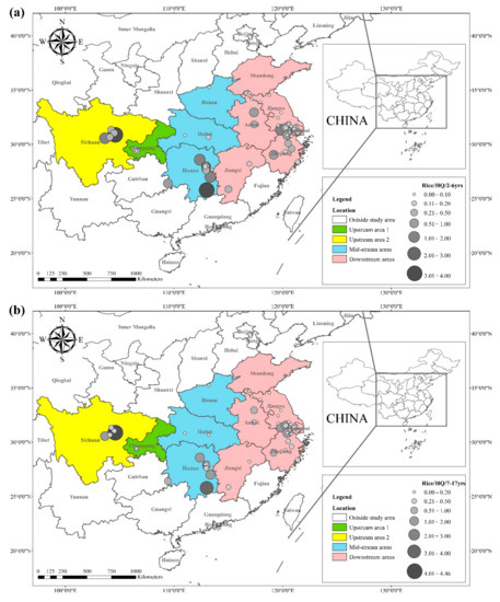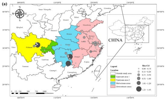 The Cd content in rice and wheat in Hunan Province increased significantly. Studies reported that the average concentration of Cd in rice and wheat was 0.21 mg kg−1 and 1.08 mg kg−1, respectively. Hunan province is known for its rich non-ferrous metals and extensive mining industry. The elevated Cd concentration in the paddy soils in Hunan province was highly correlated with the mining activities, and non-ferrous metal smelting was mainly conducted in the Xiangjiang River Basin. Studies on Cd pollution in paddy fields in the Xiangjiang River Basin showed that the average concentrations of Cd in paddy soils in Chenzhou, Xiangtan, Hengyang, Zhuzhou, Changsha, and Xiangyin city were 3.01, 1.93, 1.73, 0.50, 0.39, and 0.66 mg kg−1, respectively, all exceeding the recommended level [95,96].