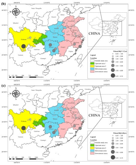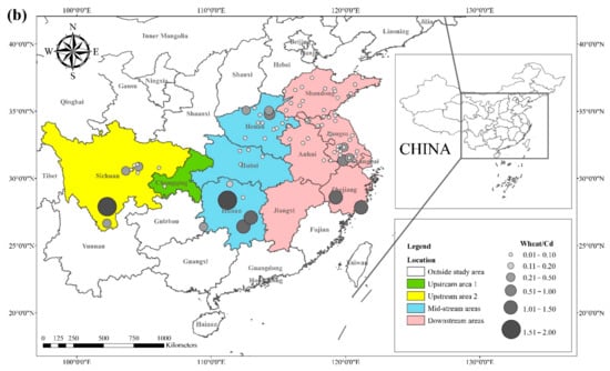 The literature survey results showed that the regions where both rice and wheat were grown were mainly in nine provinces and two municipalities around the Yangtze River Basin and southeast of the Yellow River Basin, including Sichuan, Chongqing, Hubei, Hunan, Jiangxi, Anhui, Zhejiang, Jiangsu, Shanghai, Shandong, and Henan provinces. Table 1 shows the results of other studies on the Cd pollution of rice and wheat cropping systems in China. The retrieved data showed that the average concentration of Cd in rice ranged from 0.0070 mg kg−1 to 1.45 mg kg−1. The proportion of studies where the Cd concentration in rice was lower than the national food safety standard limit (GB 2762-2017) (0.2 mg kg−1) was 79%. The spatial distribution of Cd concentration in rice is presented in Figure 1a, with larger dots representing higher Cd concentrations. Studies on excess Cd content in rice were mainly conducted in the central part of Sichuan province in the upper reaches of the Yangtze River, the southwest of Chongqing, the southeast and northeast of Hunan, as well as the northern part of Anhui, southern Jiangsu, and northern Zhejiang in the Yangtze River Delta region. Studies on Cd accumulation in rice have also been conducted in other major rice-producing countries, including Thailand, Bangladesh, Indonesia, and India. Effective methods should be formulated to remediate Cd-contaminated rice in Punjab (India, 0.99 mg kg−1) and Mae Tao (Thailand, 0.329 mg kg−1), where the average Cd concentration in rice exceeds the required limit. The spatial distribution of Cd concentrations in wheat is shown in Figure 1b. The average concentration of Cd in wheat ranged between 0.0080 mg kg−1 and 2.0 mg kg−1, and the proportion of studies where the Cd concentration in wheat was lower than the national food safety standard (0.1 mg kg−1) was 83%. Studies on excessive Cd concentration in wheat were mainly conducted in the southern part of Sichuan in the upper reaches of the Yangtze River, the southeastern and northern parts of Hunan Province, the southern part of Jiangsu, and the southern part of Zhejiang in the Yangtze River Delta region, as well as Shandong and Henan provinces in the southeast of the Yellow River Basin. The Cd pollution of wheat in the rice and wheat cropping system was relatively low compared with the Cd pollution in rice, and the pollution area was smaller for wheat.