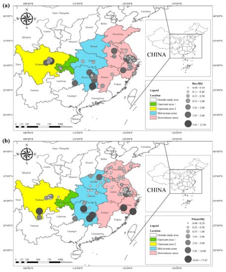 HQ of Cd in (a) rice and (b) wheat, based on data collected from previous studies.