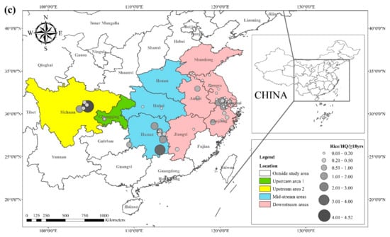(a) HQ/2–6 yrs., (b) HQ/7–17 yrs., and (c) HQ/ ≥ 18 yrs. of Cd in rice, based on data collected from previous studies.