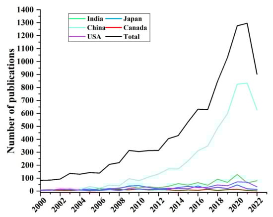 The main research fields that explored Cd pollution in the rice and wheat cropping system included environmental science, soil science, agricultural science, plant science, and environmental toxicology. The results showed that the most studied discipline was environmental science, followed by environmental toxicology research. Papers that reported findings on Cd pollution in rice and wheat cropping system were mainly research articles. Most articles published between 2000 and 2022 were mainly from the Environmental Science, Soil Science, Environmental Toxicology, and Plant Science fields, indicating that studies on Cd contamination in rice and wheat cropping system have been explored under these four categories for several years. Articles published in the top 10 most common journals are presented in Table 3. The Journal of Environmental Science and Pollution Research, Ecotoxicology and Environmental Safety and Science of the Total Environment had the highest number of published articles, with three hundred or more articles in each journal. The Chinese Academy of Sciences (China) had the highest number of published articles, followed by Nanjing Agricultural University (China) and Zhejiang University (China) (Figure 5). Internationally, the top five countries in terms of the number of articles on Cd contamination were China, Japan, India, the United States, and Canada. The distribution of the number of publications between 2000 and 2022 is shown in Figure 6. A total of 10,465 publications have been published since 2000. The number of articles on Cd contamination in rice and wheat cropping system published increased between 2002 and 2022. A significant increase in the number of articles in this field has been observed since 2016. A total of 1295 articles were published in 2021, which is 15.6 times higher than the number of articles published in 2000. At the current rate of growth in paper publications, the number in 2022 will be higher than in any other year. The number of articles shared among China, Japan, India, the US, and Canada indicates that these countries have collaborated on research on Cd contamination in rice and wheat cropping systems. The collaboration comprised joint studies by researchers from different countries (Supplementary Materials).