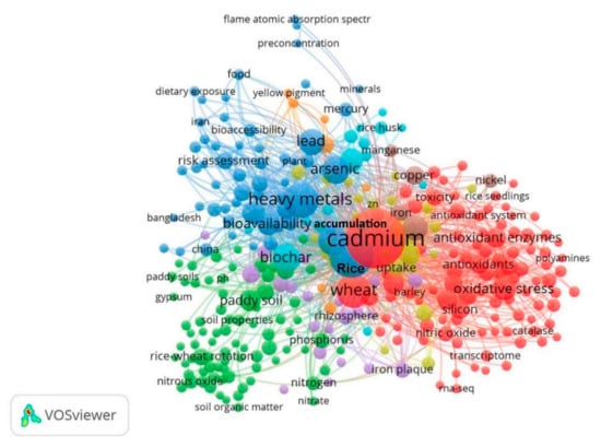 In addition to keywords such as “Bioavailability”, “Heavy metals”, “Wheat”, “Arsenic”, and “Biochar”, “Cadmium”, “Lead”, “Mercury”, and “Copper” were explored as they are pollutants that significantly affect wheat and rice production (Figure 7). The results showed that Cd had the highest research frequency and the strongest correlation. Cd is highly water-soluble, has high bioavailability, and is readily absorbed by plants. Therefore, it easily enters the food chain, thereby threatening human health. The current research hotspots and progress of Cd pollution in the rice and wheat cropping system were summarized through a blue, red, and green cluster analysis. The keyword “Bioavailability” in the blue cluster indicated that research on heavy metal pollution in rice and wheat cropping systems in recent years mainly focused on the bioavailability characteristic. The keyword “Risk assessment” indicated that the research mainly focused on the potential ecological risks of heavy metals to conduct a hazard assessment of heavy metals in polluted areas. Wheat can accumulate high amounts of Cd mainly through the roots compared with other grains. The Cd is transferred to the aerial parts of the wheat plant and finally accumulates in the wheat [178,179]. Therefore, wheat products are major sources of Cd intake in humans. Keywords such as “Rice field soil”, “Rice wheat”, “Soil properties”, and “Root system” in the red cluster indicated that the recent research mainly focused on the evaluation of changes in paddy soil properties to determine Cd levels in soil roots under the rice and wheat cropping system. Cd has a higher toxicity to wheat than other heavy metals such as Cr [35]. Cd toxicity reduces uptake and transport of essential elements in plants, including wheat [36]. Cd toxicity significantly affects wheat root growth and morphology. Keywords such as “Wheat”, “Antioxidative enzymes”, “Toxicity”, and “Oxidative stress” in the red cluster indicated that recent studies mainly explored the role of the antioxidant enzyme system of wheat in alleviating toxicity of heavy metals in vivo. Cd toxicity promotes several physiological changes in photosynthesis, the reduction of sugar and soluble proteins, and the modulation of antioxidant enzyme activities in shoots [37,38,180]. In addition, Cd toxicity increases reactive oxygen species (ROS) production, leading to oxidative stress in plants [39,181,182,183]. Oxidative stress causes a reduction in plant growth, biomass, and yield [184]. The articles included in this review indicated that the overproduction of reactive oxygen species (ROS) is the main mechanism for Cd toxicity in wheat and other plants [38,185]. High Cd levels increase the malondialdehyde (MDA) content in the shoots and roots of wheat [19]. Notably, plant responses to Cd toxicity vary among wheat cultivars. For instance, the durum wheat variety accumulated higher Cd concentrations than the bread wheat variety [180,186,187,188,189]. The rice and wheat cropping system is a common crop planting practice used in the Yangtze River Delta region of China. Most studies on rice and wheat cropping systems included in this review were mainly on changes in nutrient budgets [67], carbon sinks [190], and other agricultural production parameters. Therefore, further studies on the accumulation and pollution of heavy metals under the crop rotation system should be conducted. The results reported in this study provide a basis for the formulation and application of agronomic measures for rice and wheat cropping systems to reduce heavy metal pollution.