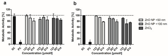 The MTT assay was conducted to examine the influence of ZnO NP on the metabolic activity of mono- and cocultured cells. In the Caco-2 monoculture, there were no significant differences between ZnO NP- or ZnCl2-treated cells and the untreated control (Figure 2a). The lowest metabolic activity was found after 24 h of incubation with 614 µmol/L ZnO NP < 50 nm (79.9 ± 10.5%). In the Caco-2/HT29-MTX coculture, there were also no significant differences between untreated and ZnO NP- or ZnCl2-treated cells. Treatment with 614 µmol/L ZnO NP led to slightly decreased metabolic activity (residual activity: 77.8 ± 1.5% for ZnO NP < 50 nm; 78.2 ± 6.2% for ZnO NP < 100 nm; Figure 2b). ZnCl2 showed the strongest effects on cocultured cells: metabolic activity decreased to 71.4 ± 13.4% after treatment with 307 µmol/L and 75.2 ± 2.3% after treatment with 614 µmol/L.