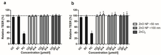 Relative TEER of Caco-2 monoculture (a) and Caco-2/HT29-MTX coculture cells (b) after 24 h treatment with ZnO NP and ZnCl2. UC: untreated control; SC: solvent control (5% Millipore water); PC: positive control (0.1% Triton X-100 + 10 mM EGTA apical, 10 mM EGTA basolateral). Dashed line (=100%) implies TEER before incubation. Data are expressed as mean + standard deviation; n = 16. Significant differences compared to UC (* p ≤ 0.05) were obtained by one-way analysis of variance/Ryan–Einot–Gabriel–Welsh post hoc test.