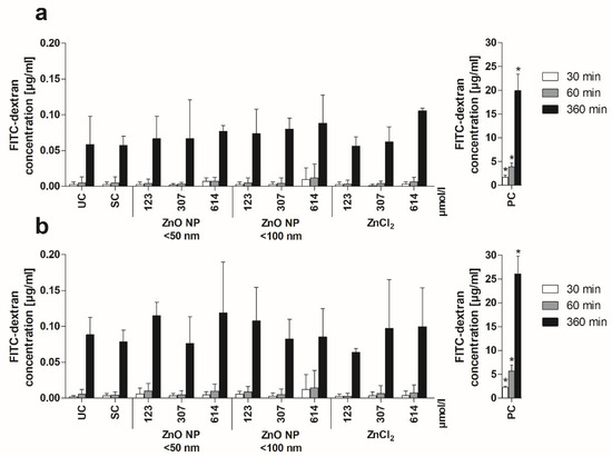 Basolateral FITC-dextran concentrations of Caco-2 monoculture (a) and Caco-2/HT29-MTX coculture cells (b) after 24 h of treatment with ZnO NP and ZnCl2 and subsequent apical addition of FITC-dextran. UC: untreated control; SC: solvent control (5% Millipore water); PC: positive control (0.1% Triton X-100 + 10 mM EGTA apical, 10 mM EGTA basolateral). Data are expressed as mean + standard deviation; n = 3. Significant differences compared to UC (* p ≤ 0.05) were obtained by one-way analysis of variance/Ryan–Einot–Gabriel–Welsh post hoc test.
