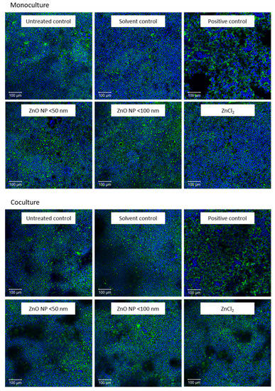 Third, staining with phalloidin and DAPI should microscopically reveal the influence of ZnO NP on the cytoskeleton and cell nuclei. The effects of the highest concentration (614 µmol/L) of ZnO NP and ZnCl2 in comparison with untreated, solvent and positive control cells are shown in Figure 5. Caco-2 monocultured cells formed a flat monolayer, while the cocultured monolayer exhibited elevations. Treatment with the positive control lowered and partially dissolved the cell monolayer anchorage. These cells seemed to be spherical. However, incubation with ZnO NP and ZnCl2 had neither influence on cytoskeletal nor nuclear morphology.