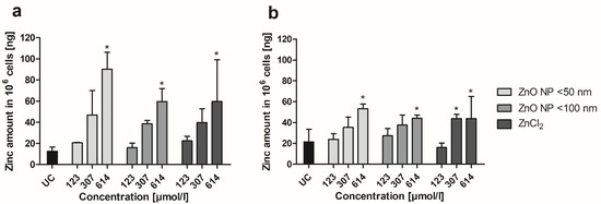 By using ICP-MS, zinc uptake of Caco-2 monocultured and Caco-2/HT29-MTX cocultured cells was determined after ZnO NP and ZnCl2 incubation. At first, the cellular zinc amount was measured and calculated for 1 × 106 cells (Figure 6). This revealed a concentration-dependent accumulation of zinc in both cultures, with a smaller increase under coculture conditions. Treatment with 614 µmol/L ZnO NP led to significantly increased zinc amounts in monocultured cells (90.3 ± 15.9 ng zinc in 106 cells for ZnO NP < 50 nm; 59.6 ± 12.2 ng zinc in 106 cells for ZnO NP < 100 nm) and cocultured cells (53.2 ± 4.6 ng zinc in 106 cells for ZnO NP < 50 nm; 44.1 ± 3.1 ng zinc in 106 cells for ZnO NP < 100 nm) compared with untreated controls (monoculture: 12.7 ± 3.9 ng zinc in 106 cells; coculture: 21.5 ± 12.1 ng zinc in 106 cells). Similar effects were observed for ZnCl2. There was a significantly increased zinc amount in monocultured cells after treatment with 614 µmol/L ZnCl2 (59.8 ± 39.4 ng zinc in 106 cells) and in cocultured cells after treatment with ≥307 µmol/L ZnCl2 (43.8 ± 4.2 ng zinc in 106 cells for 307 µmol/L; 43.8 ± 21.2 ng zinc in 106 cells for 614 µmol/L) compared with untreated controls.
