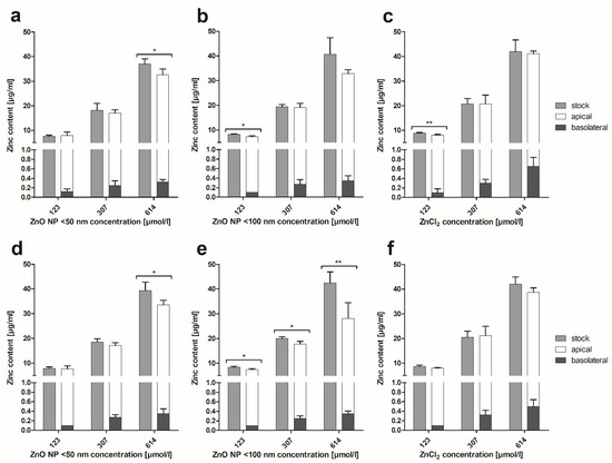Zinc content of apical and basolateral supernatants of Caco-2 monoculture (a–c) and Caco-2/HT29-MTX coculture cells (d–f) after 24 h of treatment with ZnO NP and ZnCl2 compared to the stock dispersions. Data are expressed as mean + standard deviation; n = 4. Significant differences between zinc amounts before (stock) and after incubation (apical + basolateral; * p ≤ 0.05; ** p ≤ 0.01) were obtained by unpaired t-tests.