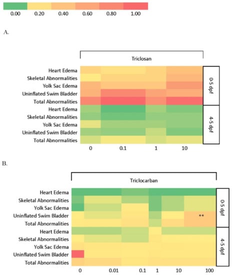 - Falisse, E.; Voisin, A.-S.; Silvestre, F. Impacts of triclosan exposure on zebrafish early-life stage: Toxicity and acclimation mechanisms. Aquat. Toxicol. 2017, 189, 97–107. [Google Scholar] [CrossRef] [PubMed]
