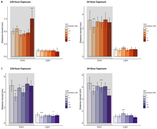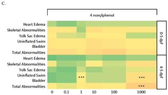 Phillips, J.; Haimbaugh, A.S.; Akemann, C.; Shields, J.N.; Wu, C.-C.; Meyer, D.N.; Baker, B.B.; Siddiqua, Z.; Pitts, D.K.; Baker, T.R. Developmental Phenotypic and Transcriptomic Effects of Exposure to Nanomolar Levels of 4-Nonylphenol, Triclosan, and Triclocarban in Zebrafish (Danio rerio). Toxics 2022, 10, 53. https://doi.org/10.3390/toxics10020053