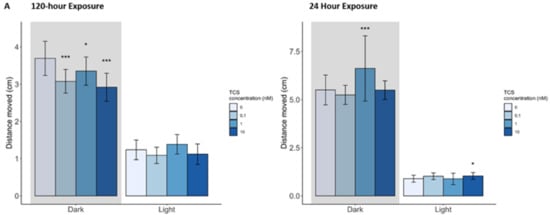 - Fritsch, E.B.; Connon, R.E.; Werner, I.; Davies, R.E.; Beggel, S.; Feng, W.; Pessah, I.N. Triclosan impairs swimming behavior and alters expression of excitation-contraction coupling proteins in fathead minnow (Pimephales promelas). Environ. Sci. Technol. 2013, 47, 2008–2017. [Google Scholar] [CrossRef] [PubMed]