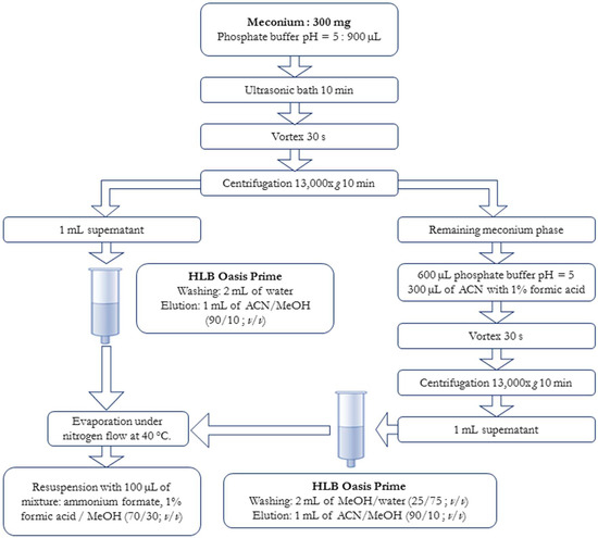 Meconium samples are stored at −80 °C before analysis. Two solid phase extractions (SPE) are carried out from the sample: (1) a first extraction devoted to DoA non cannabinoids, and (2) a second one devoted to cannabinoids. The sample amount is 300 mg of meconium (±10 mg) and 900 µL of phosphate buffer pH = 5 were added. The mixture is vortexed for 20 s following by 10 min in an ultrasonic bath. The mixture is then hydrolyzed with 100 µL of β-glucuronidase at 48 °C for 1 h. A first centrifugation is done, 10 min at rpm. (1) The supernatant is transferred into an Oasis HLB Prime column (Waters, Milford, CT, USA), which were not previously conditioned. The column is rinsed with 2 mL of water and dried for 10 min under vacuum. The molecules are then eluted with 1 mL of an acetonitrile/methanol mixture (90/10; v/v). (2) Residual meconium is reconstituted with 600 µL of buffer pH = 5 and 300 µL of acetonitrile with 1% formic acid, the sample is vortexed for 20 s and then centrifuged for 10 min at rpm. The supernatant is transferred into a novel Oasis HLB Prime column without pretreatment. After introducing the sample, the column is rinsed by adding 2 mL of methanol/water (25/75; v/v) and dried for 10 min under vacuum. The molecules are then eluted with 1 mL of an acetonitrile/methanol (90/10; v/v). The eluates are collected before being evaporated to dryness under nitrogen flow at +48 °C. The dry residue is reconstituted with 100 µL of mobile phase A (2 mM ammonium formate in water and 0.1% formic acid)/methanol (70/30; v/v). Five µL is injected into the chromatographic system. A schematic description of the procedure is presented in Figure 1.