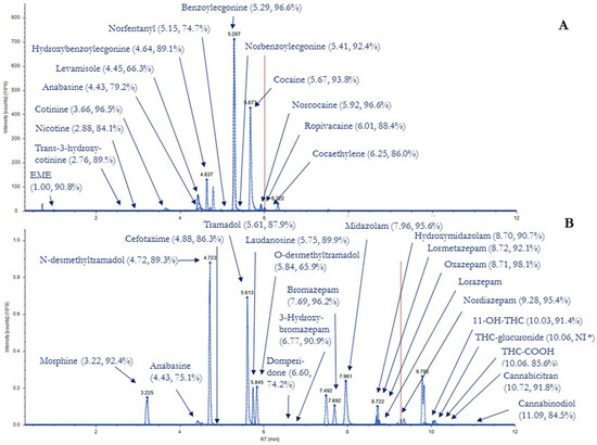 Meconium is accepted as a gold standard matrix for in utero drug exposure. It allows for a wide detection window and a non-invasive sample collection from a soiled diaper. However, it is susceptible to contamination by urine, there is a possible detection of drugs given to the newborn after birth and painkiller drugs used by the mother during labor, the specimen volume is limited and extensive extraction procedures are required for sample preparation [6]. Several studies dedicated to meconium analysis have been published [7,8,9,10,11,12,13,14,15,16,17,18,19,20]. Most of the methods have focused on the analysis of specific drug groups such as amphetamines, opioids, cannabinoids, cocaine, alcohol biomarkers, benzodiazepines or antidepressants [7,8,9,10,11,12,13,14,15,16]. Typically, each drug group is extracted and analyzed separately in meconium; this may cause problems due to the limited amount of sample, and the time-consuming procedures required for multiple drugs analysis. Very few methods devoted to large screening of meconium have been published. The first broad-spectrum drug screening of meconium was developed by Ristimaa et al. in 2010 [17]. This method relies on liquid chromatography coupled to high resolution mass spectrometry (LC-HRMS) and an in-house database containing 869 molecular drugs. More recently (2021), López-Rabuñal et al. proposed another large screening devoted to new psychoactive substances (NPS) [21]. This method allows the simultaneous determination of 137 NPS in meconium by LC-HRMS. These two methods are efficient and innovative; however, they are targeted. To our knowledge, there is no untargeted LC-HRMS method devoted to toxicological screening in meconium, and none allowing the simultaneous detection of the four main classes of DoA (amphetamines, cannabinoids, opioids and cocaine) in the current literature.