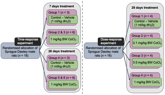 Two separate in vivo experiments were performed successively. The first experiment was a time-response experiment in which a 7-day cobalt treatment was compared against a 28-day treatment at a fixed cobalt dose. Animals were treated daily with either 1 mL/kg body weight dH2O (controls) or 1 mg/kg body weight (BW) CoCl2 doses injected i.p. (treated groups). The second in vivo experiment was a dose-response experiment. The animals were given 1 mL/kg dH2O i.p. in the case of the control group, or a range of cobalt solutions- 0.1, 0.5, or 1 mg/kg BW i.p. injections for 28 days. Figure 1 depicts the sample size and design information diagrammatically.