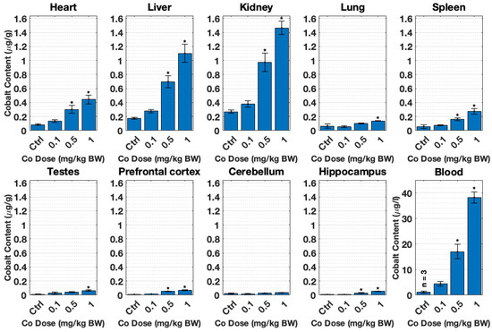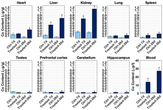 Several tissues in Figure 2 presented increased cobalt accumulation from 7- to 28-days, indicating possible cobalt time-dependent accumulation in the heart, liver, kidney, spleen, pref. cortex, and blood. However, many of the control samples in the 7-day treatment indicated high levels of cobalt (heart, liver, kidney, lung, spleen, testes, pref. cortex, and cerebellum). This augmentation is likely an artefact of ICP-MS measurements. For values closer to the Co detection limit, it could be that cobalt content is pushed to higher values.