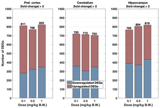 The cobalt tissue content measured through ICP-MS determined that the pref. cortex and hippocampus of 0.5 and 1 mg/kg BW CoCl2-treated groups had significantly greater accumulated cobalt compared to their control groups (Figure 3). However, to evaluate whether the incremental dose cobalt treatment resulted in a progressive transcriptomic response, the number of genes was plotted for all brain areas and the three cobalt treatments: 0.1, 0.5, and 1 mg/kg B.W. CoCl2 in Figure 4 (threshold = |fold change| > 2). Although the number of DEGs progressively increased in the hippocampus, there was no clear dose-response in terms of the number of DEGs in the pref. cortex and cerebellum.