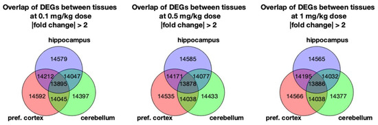 Venn diagrams showing the number of overlapping DEGs between the pref. cortex, cerebellum, and hippocampus at the different cobalt treatment doses: 0.1, 0.5, and 1 mg/kg B.W. CoCl2. Rats were treated by daily i.p. injection for 28 days. DEGs were obtained through RNA-Seq by comparing the brain parts’ mRNA abundance of the treatment groups against the controls (dH2O-treated).