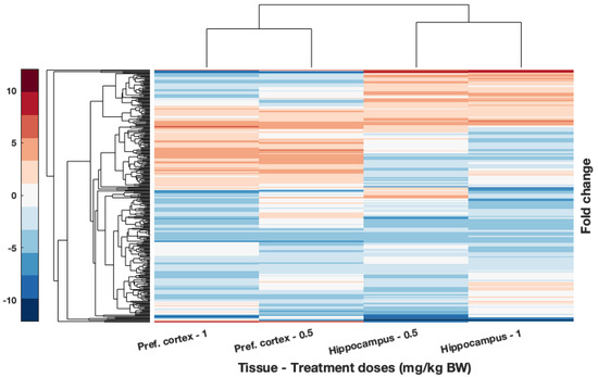 Hierarchical clustering of DEGs from brain tissues with significant accumulation of cobalt: the pref. cortex and hippocampus from rats treated with 0.5 and 1 mg/kg B.W. CoCl2. DEGs were obtained from RNA-Seq comparing the RNA isolated from those tissues with those of controls treated with dH2O. Condition applied is for fold change to be over 2. Upregulated genes are shown in red while downregulated are displayed in blue. Hierarchical clustering and resulting dendrogram were generated with Euclidian distance. Samples analysed through RNA-Seq were pooled (n’ = 1) from n = 4 pref. cortex samples, n = 3 in hippocampus from 0.5 mg/kg B.W. CoCl2 treatment group, and n = 1 from 1 mg/kg B.W. CoCl2 treatment group.