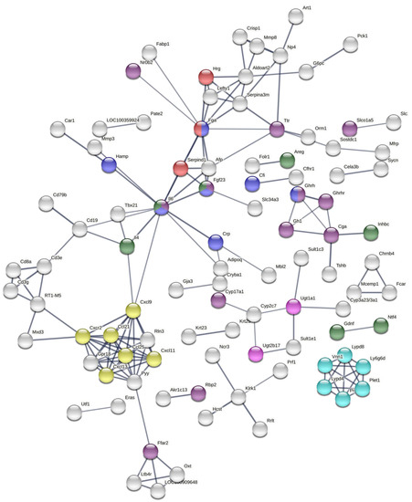Protein–protein interaction (PPI) network obtained from the STRING web tool by analysing DEGs as their protein products. DEGs were obtained from RNA-Seq analyses of the pref. cortex and hippocampus from rats treated with 0.5 and 1 mg/kg B.W. CoCl2 against controls treated with dH2O for 28 days of i.p. injections. The following terms/keywords have been highlighted: cellular response to interleukin-6 (blue), regulation of hormone levels (purple), chemokine receptors bind chemokines (yellow), blood coagulation (red), UDP-glucuronosyltransferase activity (pink), growth factor activity (green), and post-translational modification: synthesis of GPI-anchored protein (cyan). The thickness of links between nodes represent the confidence in the interaction, only nodes connected with high confidence (0.7) are displayed.