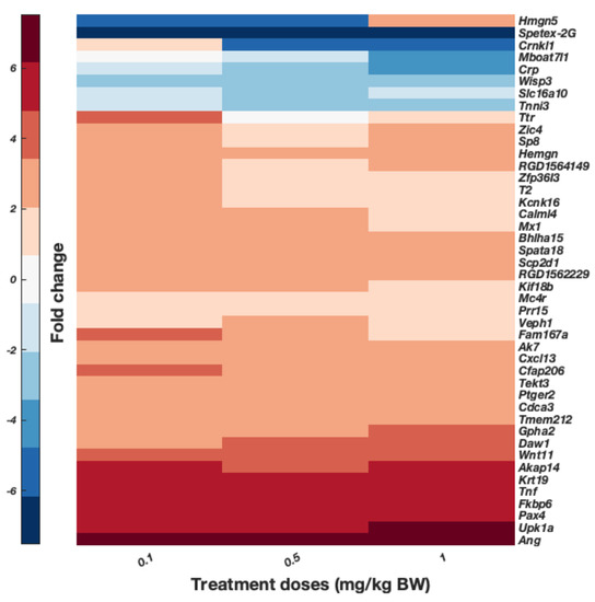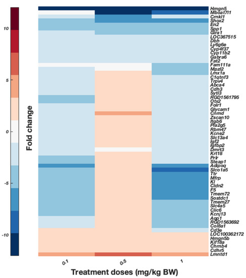 DEGs obtained from the comparison of pref. cortex from rats dosed with 0.1, 0.5, and 1 mg/kg B.W. CoCl2 against the control group (dH2O). Animals were treated for 28 days with daily i.p. injections. DEGs displayed were obtained from the RNA-Seq analysis of pooled samples (n’ = 1 from n = 4 samples per group). Fold-change gene expression is indicated by colour, as described by the bar in the right side, upregulated genes are displayed in red while downregulated are blue. Genes are displayed as determined by the hierarchical clustering of DEGs over 2-fold-change (p < 0.05 from RNA-Seq Poisson distribution), dendrogram not shown (Euclidian distance).